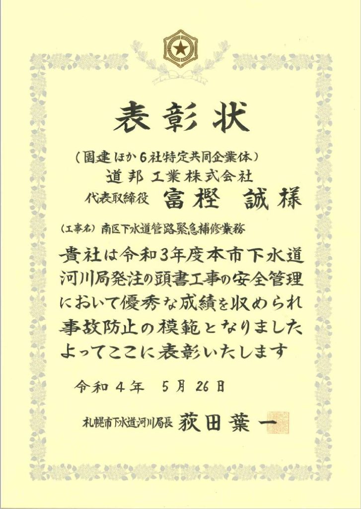 令和3年度 札幌市下水道河川局 表彰式 2022年5月30日 最終更新日時 : 2025年6月12日 doho-8892 令和3年度 札幌市下水道河川局「工事安全管理優秀業者」表彰式が行われ 南区下水道管路緊急補修業務における安全管理優秀業者として表彰をうけました。 これからもより一層、安全第一に努め業務を行いたいと思います。